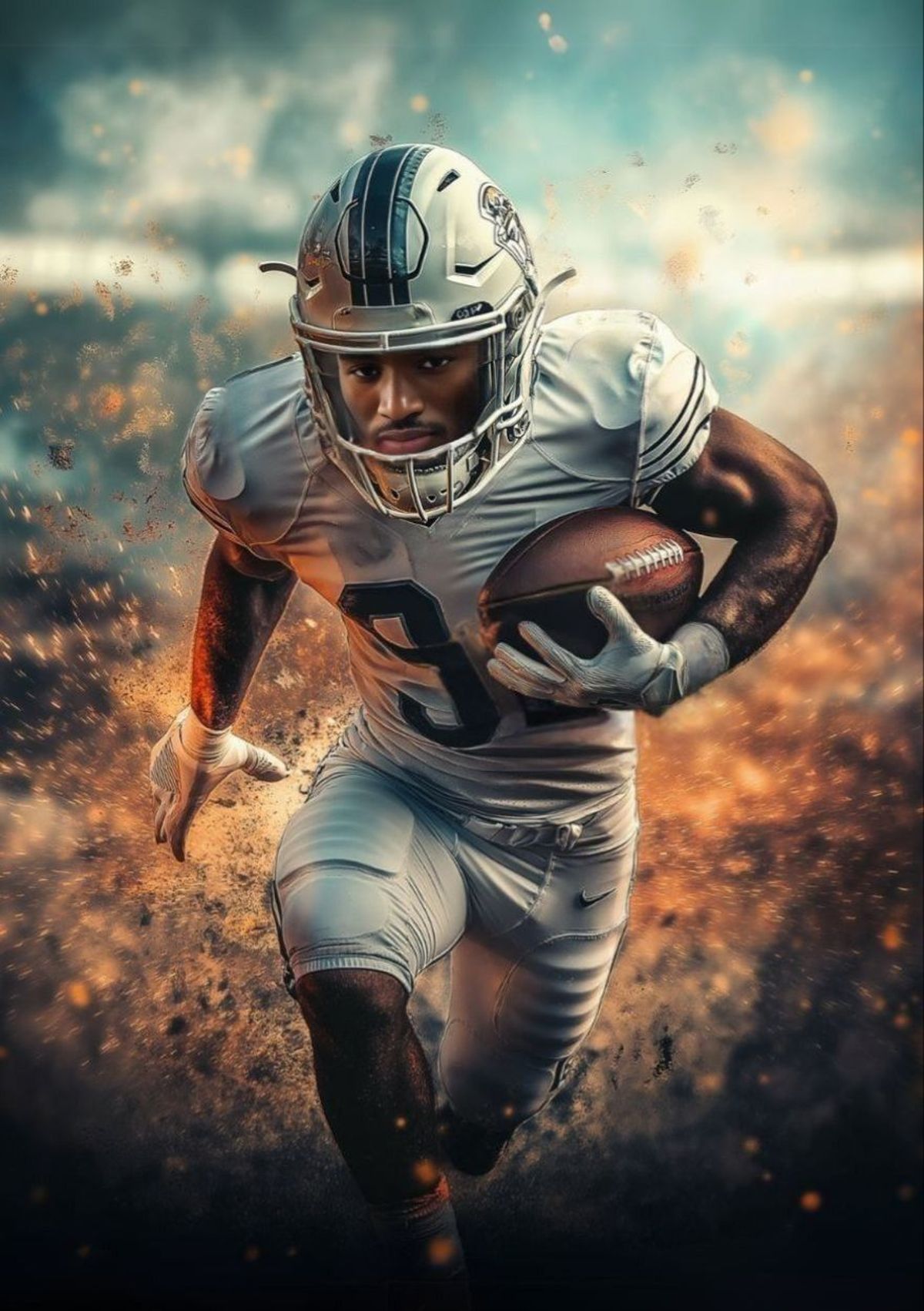 Hit the gap at full speed. Swap your face onto this charging football runner and turn every glance into a highlight-reel moment.