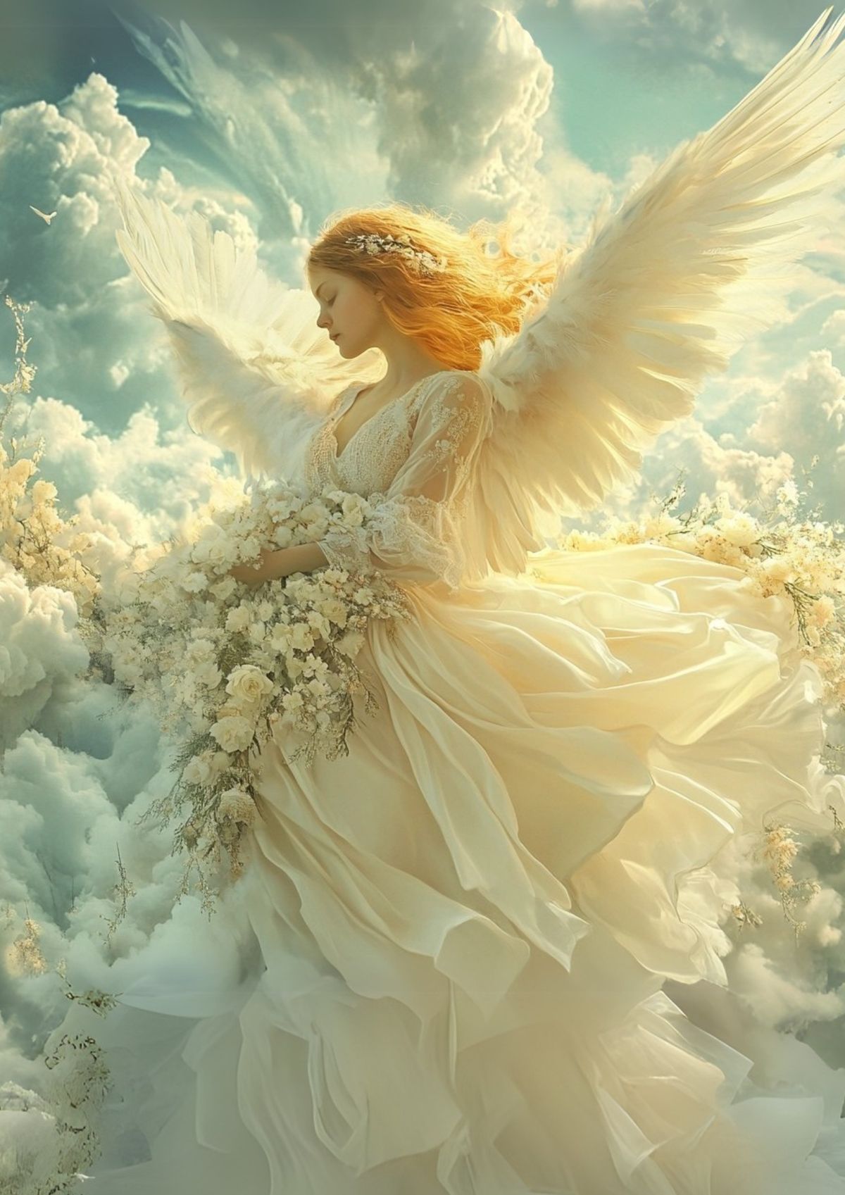Float above the clouds and swap your face onto this luminous angel bride for a look that is pure heaven.