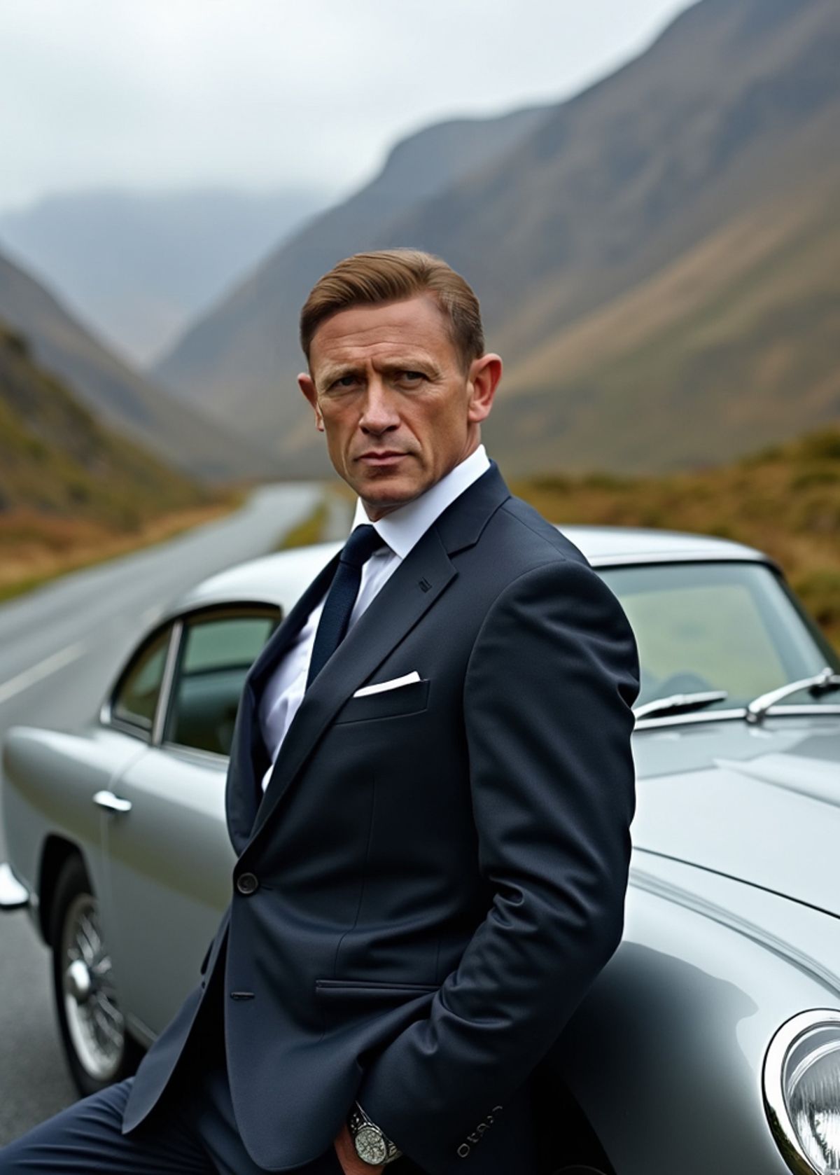 Sharp suit, classic motor, mountain road. Swap your face onto this cool-headed spy and make your getaway look outrageously stylish.