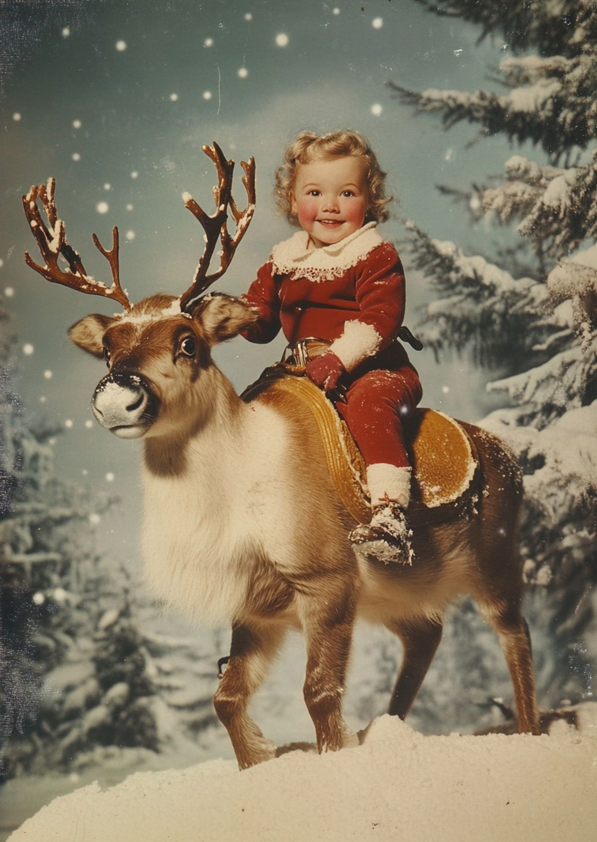 Straight to the nice list. Swap your face onto this vintage reindeer ride and turn a snowy Christmas scene into your cutest festive moment yet.