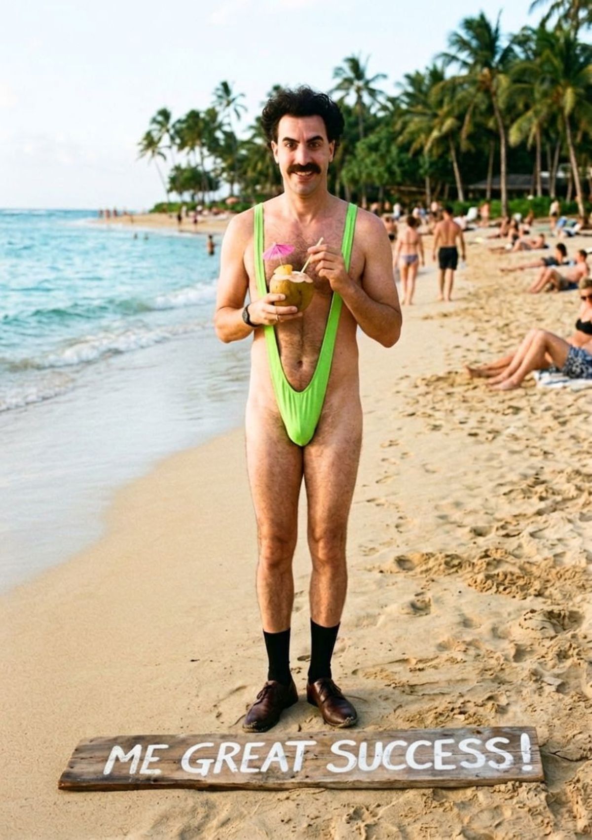 Sun, sand, and zero dignity. Swap your face onto this outrageous beach look and serve holiday confidence by the coconutful.