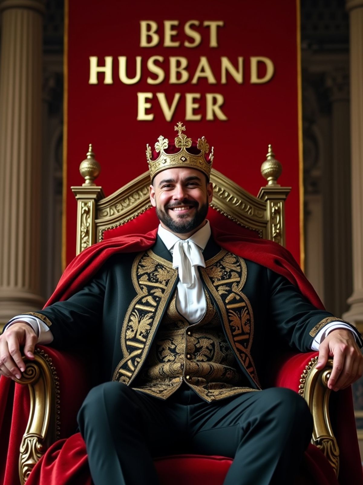 Crown him properly. Swap his face onto this throne-room portrait and turn Best Husband Ever into an official title.