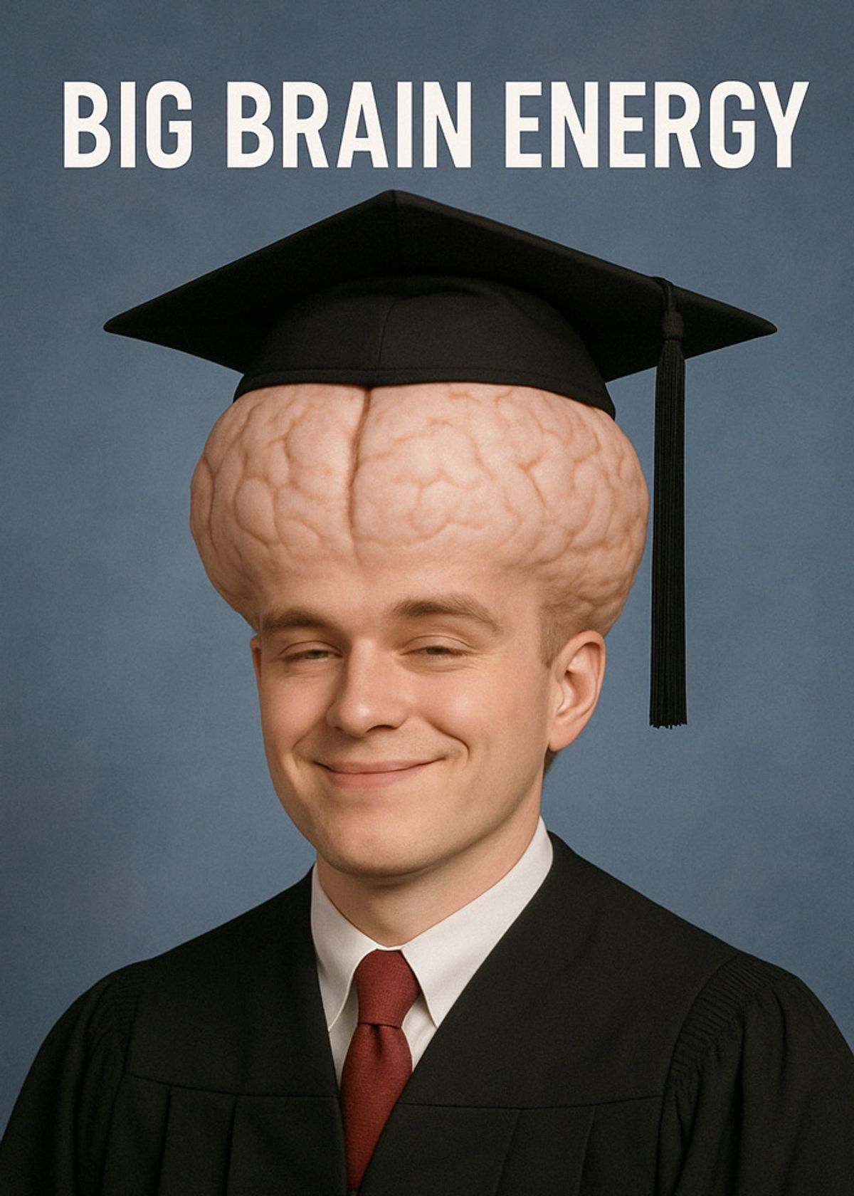 Swap your face onto this gloriously overqualified graduate and serve cap, gown, and impossible levels of brainpower.
