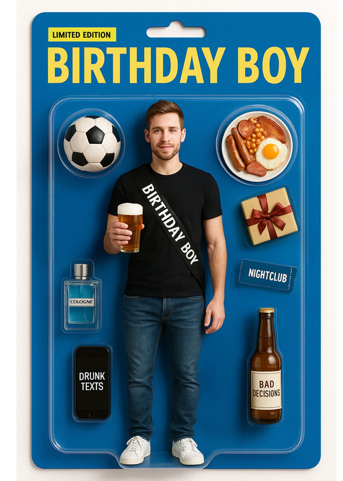 Big night energy, boxed and ready. Swap your face onto this Birthday Boy action figure and come fully equipped with beer, bad decisions, and a victory breakfast.