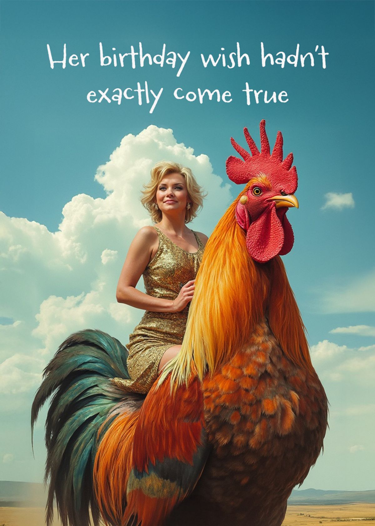 Her birthday wish got weird fast, so swap your face onto this giant rooster rider and steal the spotlight with glorious chaos.