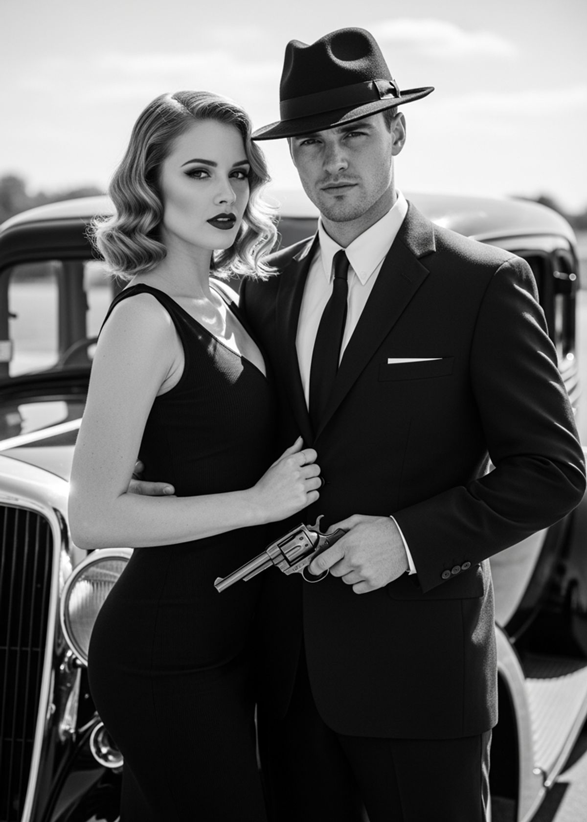 Swap your faces into this sharp-dressed noir duo and look like the two names everyone whispers about after dark.