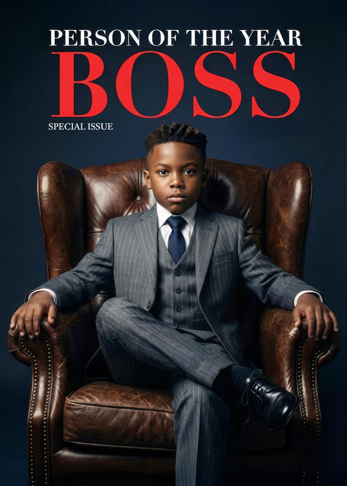Big chair, bigger energy. Swap your face onto this sharp cover-style design and make power look effortless.