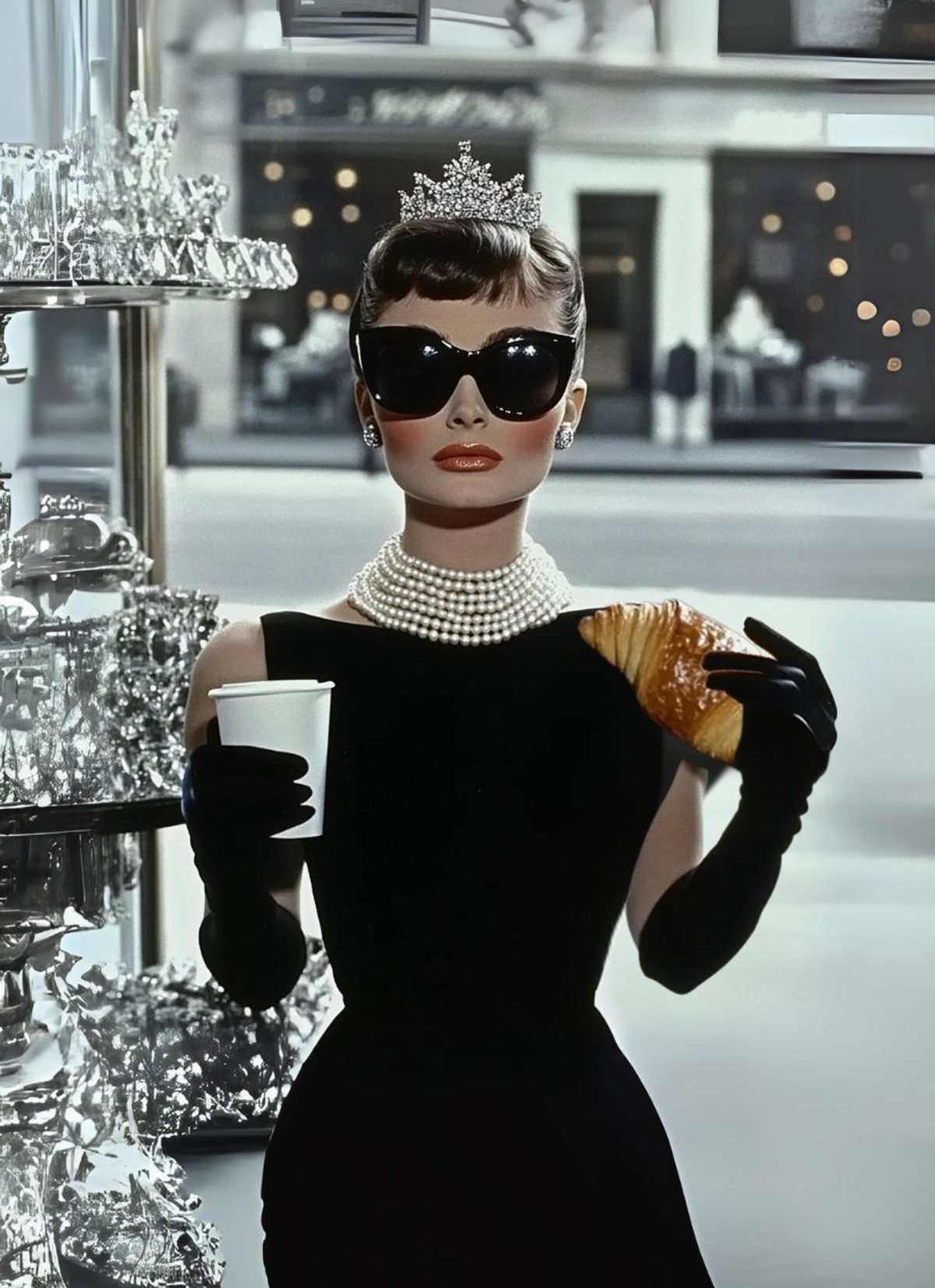 Coffee, croissant, and pure Audrey Hepburn energy. Swap your face into this timeless city-glam look and serve elegance before 9am.