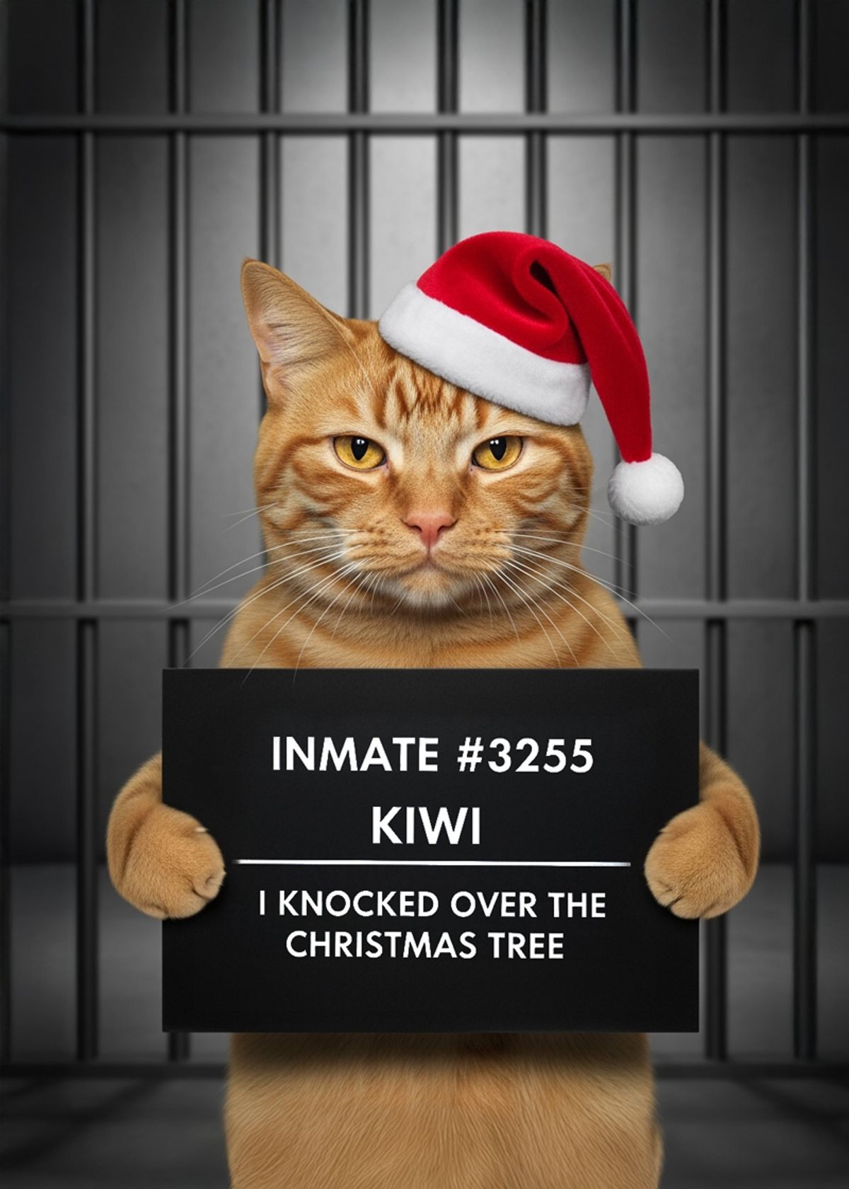 Caught red-pawed. Swap your pet into this festive mugshot and let them take the fall for the Christmas tree chaos.