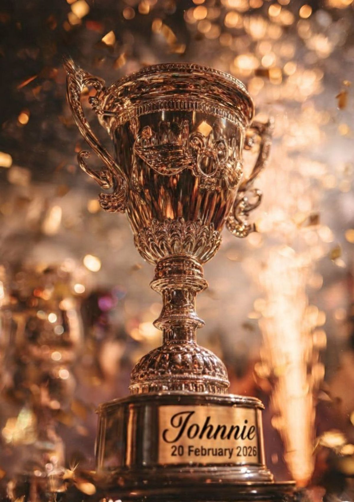 Your winning moment, engraved in style. Add any name and date to this dazzling trophy design and make the celebration look properly legendary.