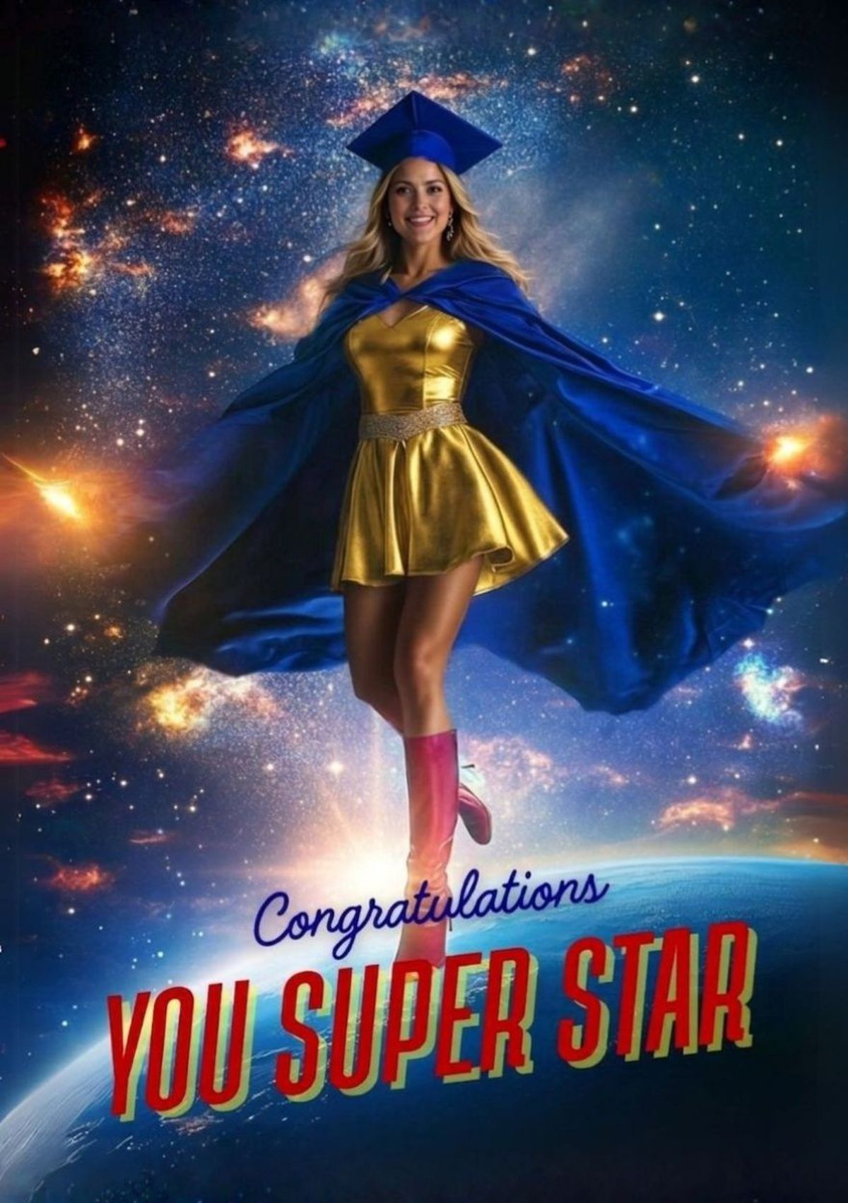 Cap, cape, and your face come together in this cosmic graduation swap that makes their big day feel truly out of this world.