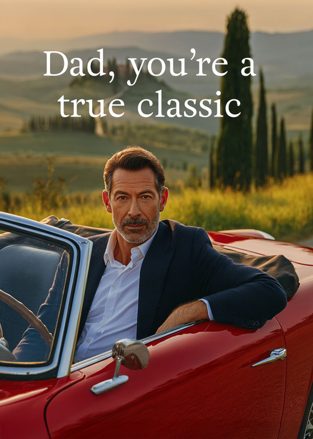 Suave never ages. Swap Dad's face into this classic car scene and let him cruise into legend like the timeless gent he is.