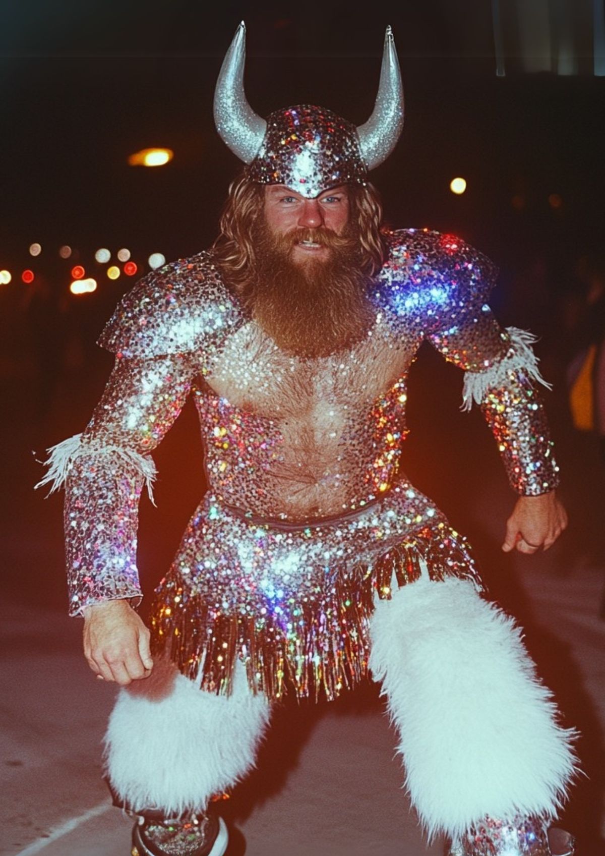 Go full glitter berserker. Swap your face onto this rhinestone-clad horned warrior and stomp straight into the spotlight.