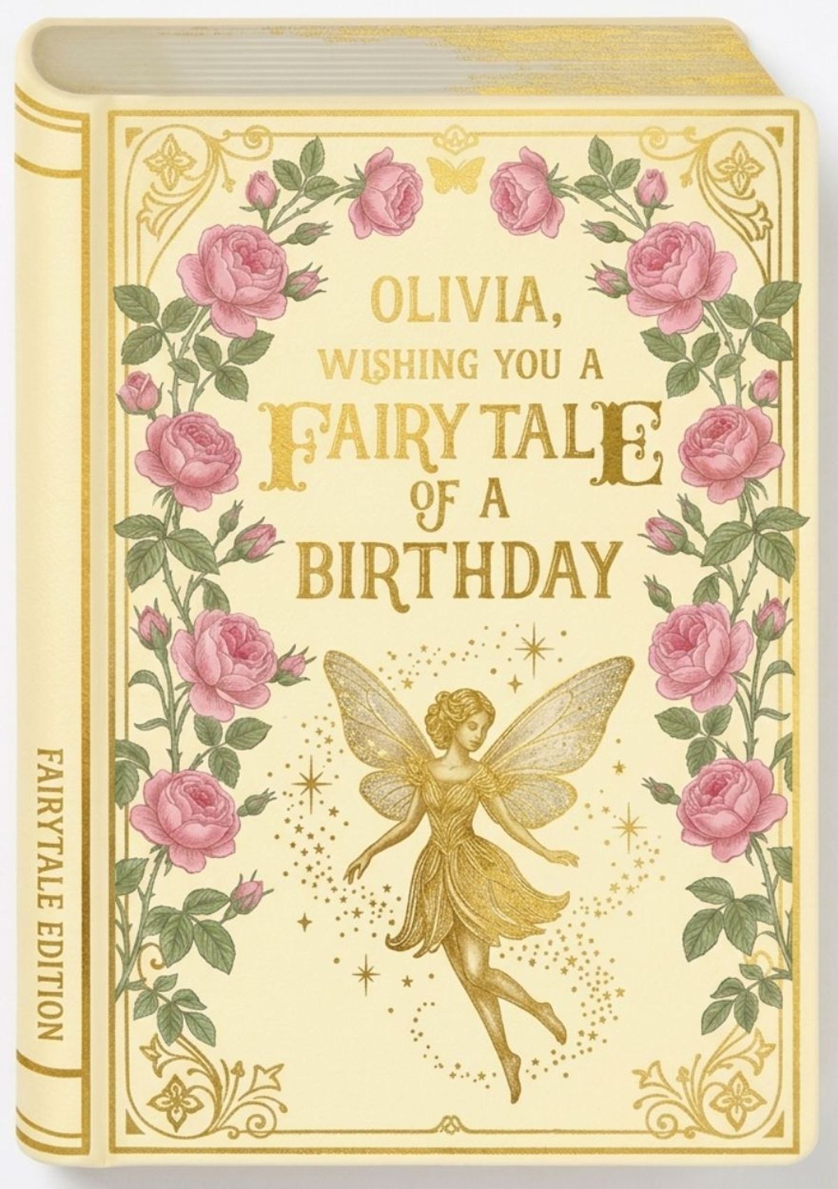 Swap your face onto this golden fairy tale cover and turn a birthday into a storybook moment with true main character magic.
