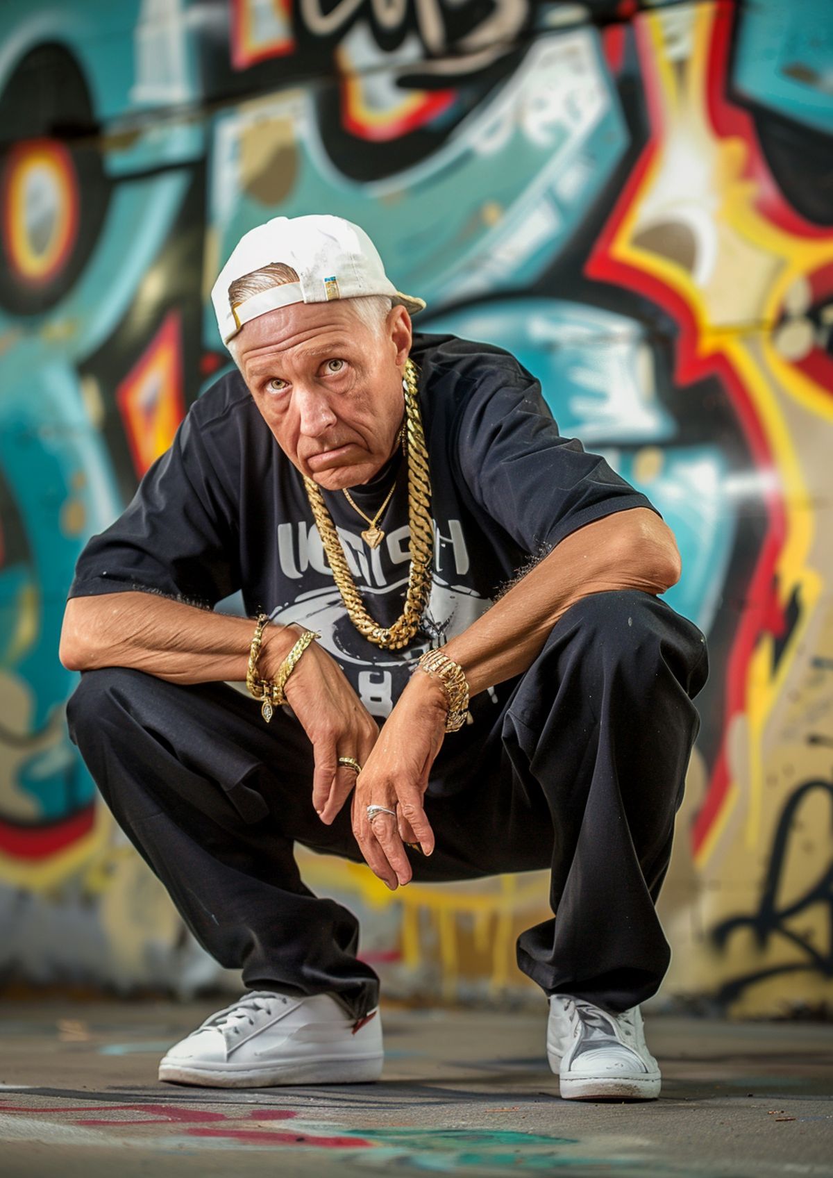 Swap your face onto this chain-draped street king and bring big swagger to the pavement, no mic skills required.