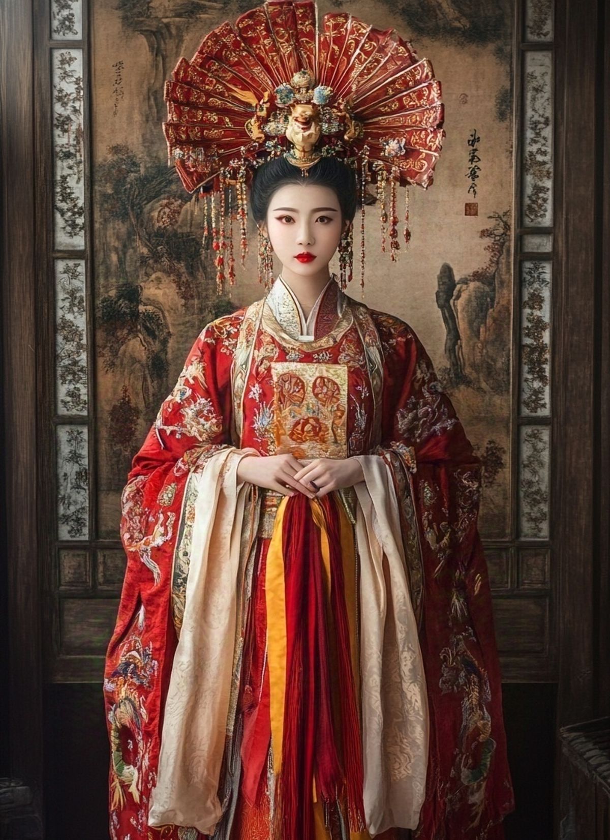 Command the room in embroidered silk and a towering headdress by swapping your face onto this breathtaking imperial empress portrait.