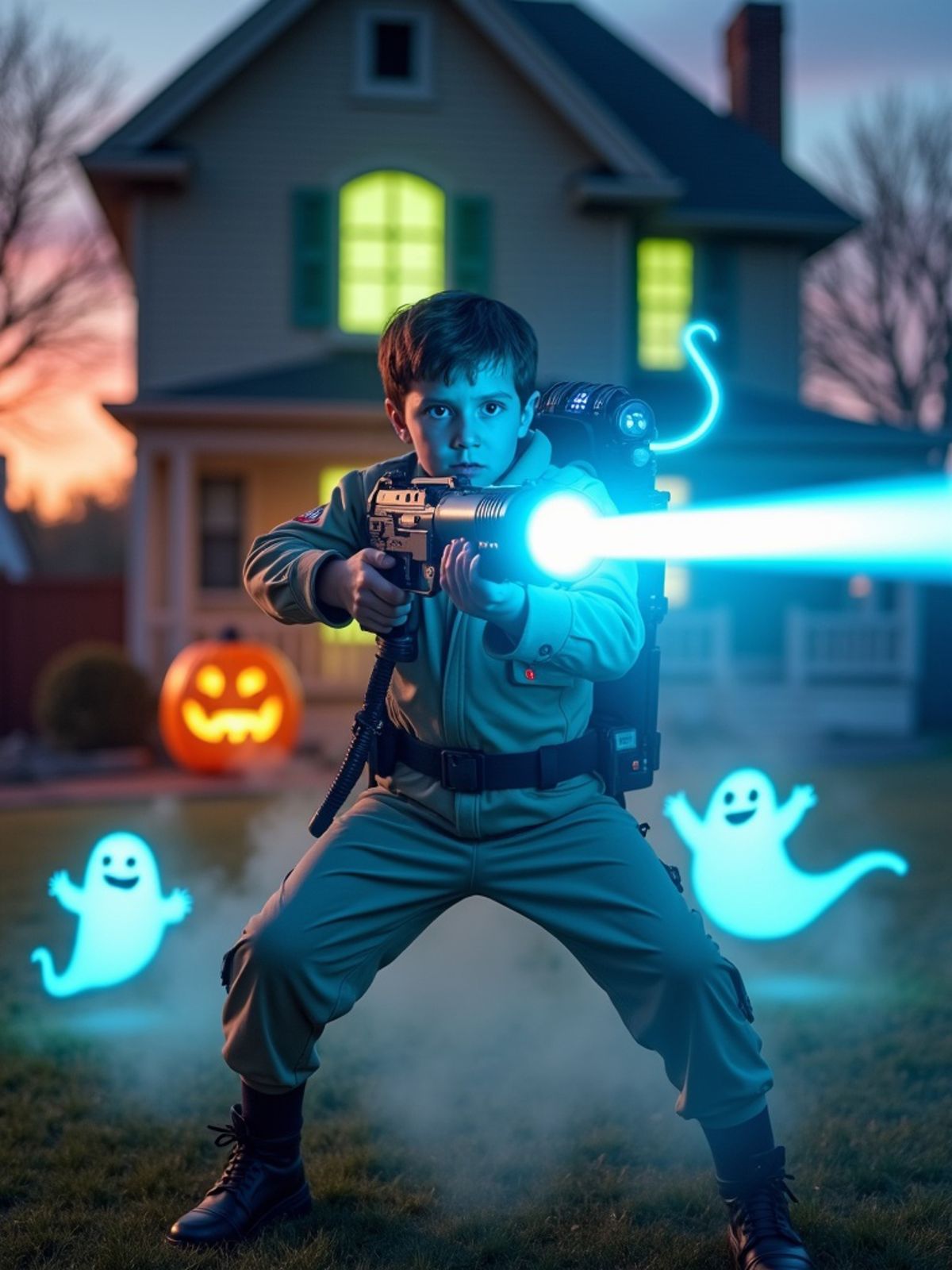 Swap your face onto this fearless ghost hunter and light up the lawn like the neighbourhood's newest paranormal problem solver.