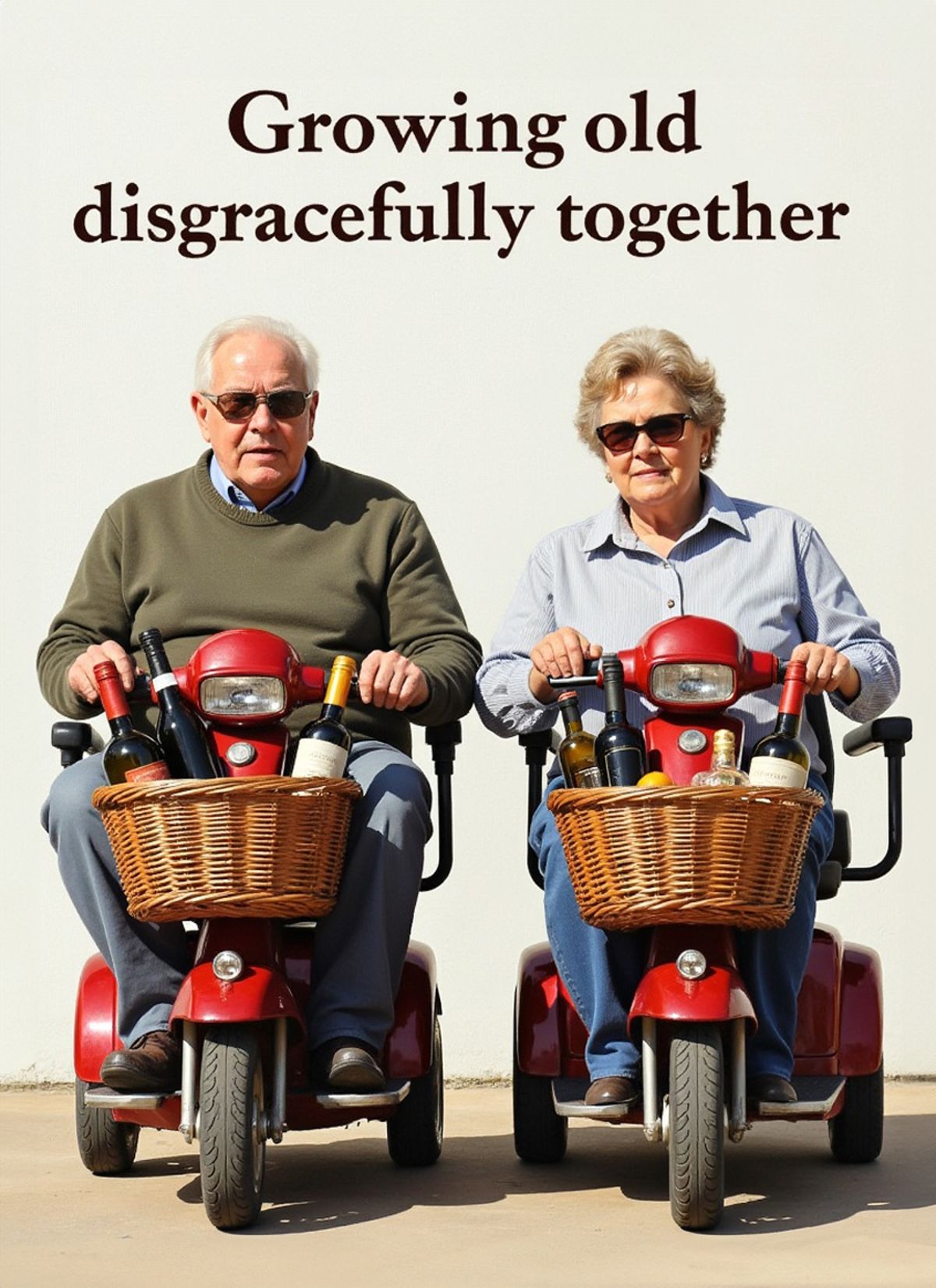 Swap your faces onto this wine-loaded scooter duo and prove growing old together can still be gloriously chaotic.