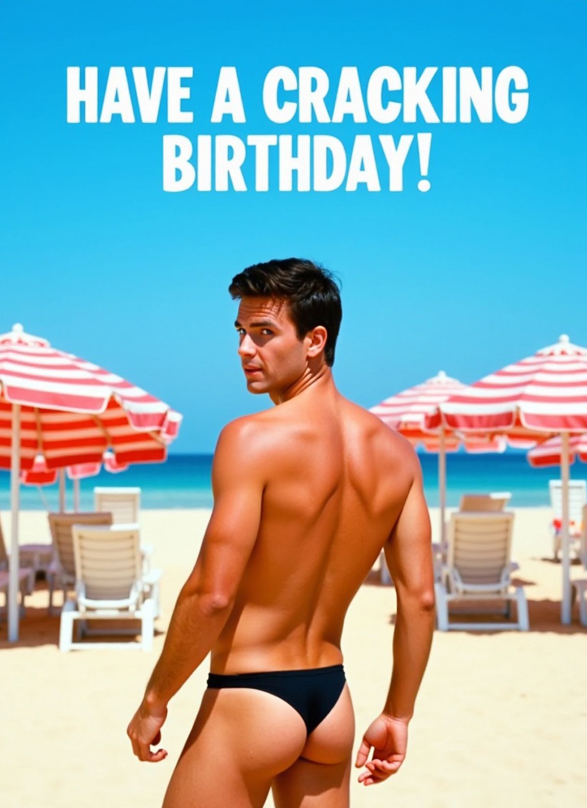 Wish them a cracking birthday by swapping your face onto this sun-soaked beach bum and delivering cheeks, charm, and zero subtlety.