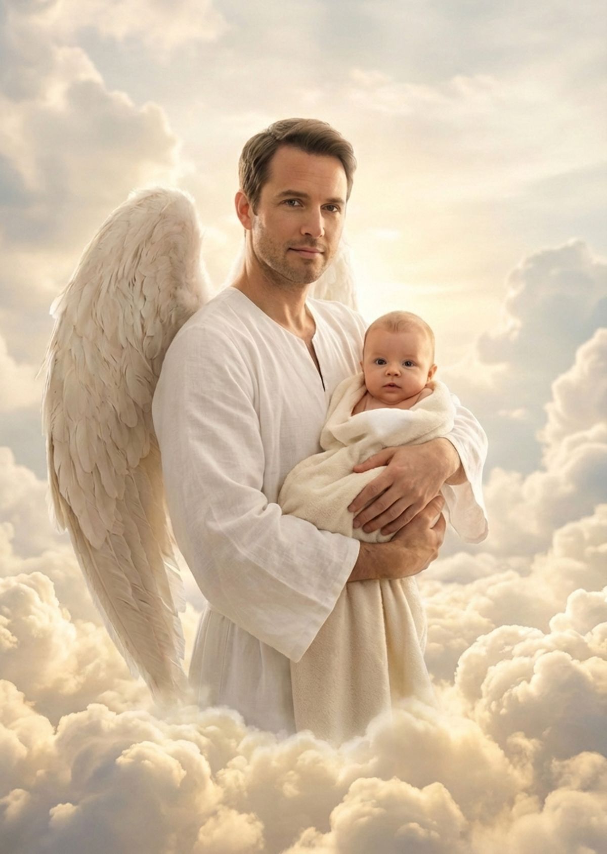 Wrap your face in heavenly light, step into angel wings, and hold your little one like the guardian you were born to be.