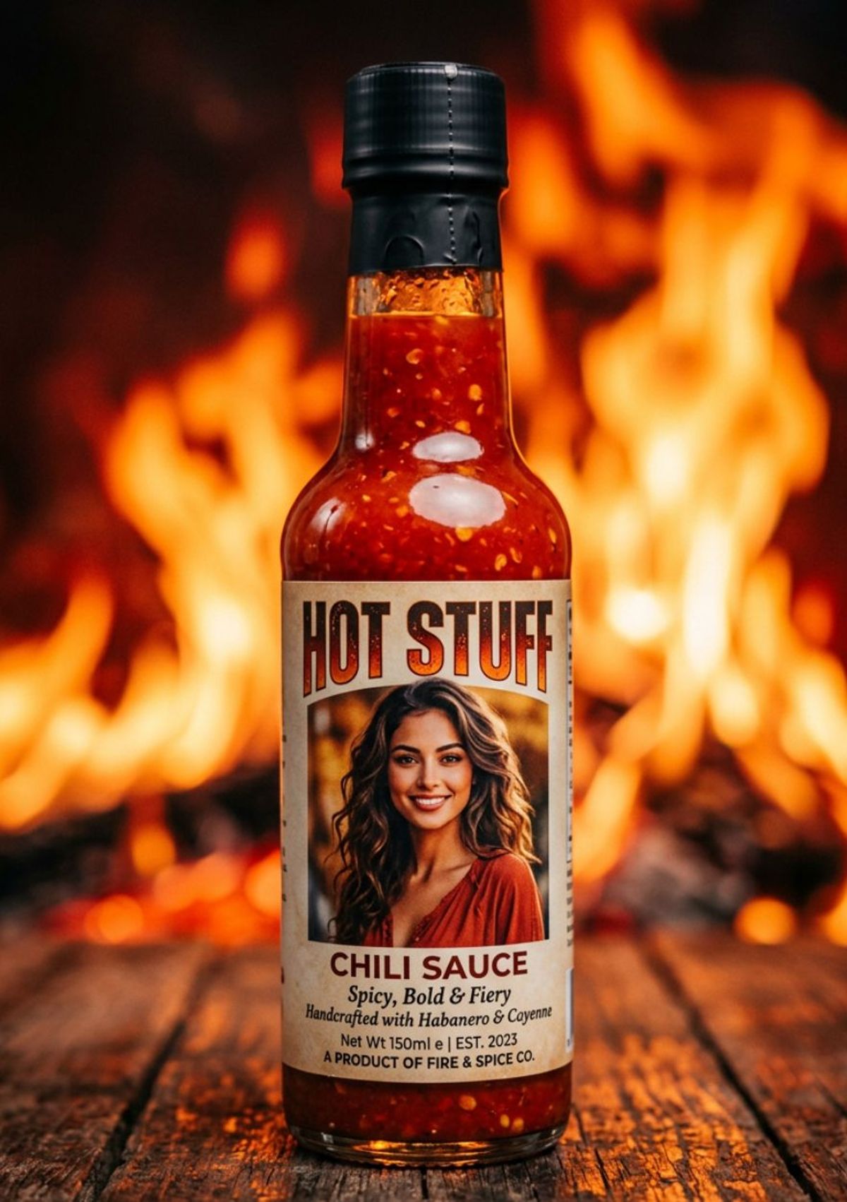 Too hot to handle. Swap your face onto this fiery chili sauce label and turn up the heat on every shelf.