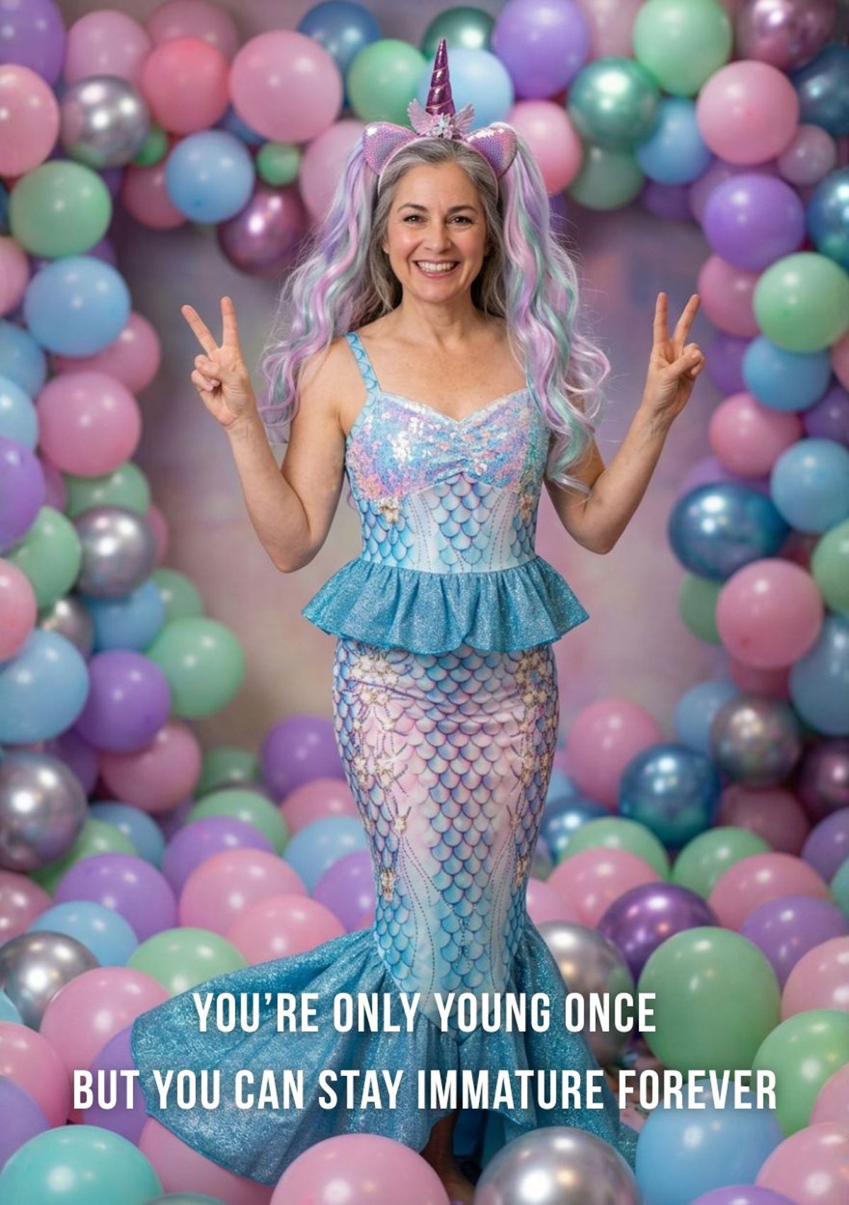 Swap your face onto this glittery mermaid look and serve pastel party chaos with absolutely no intention of acting your age.