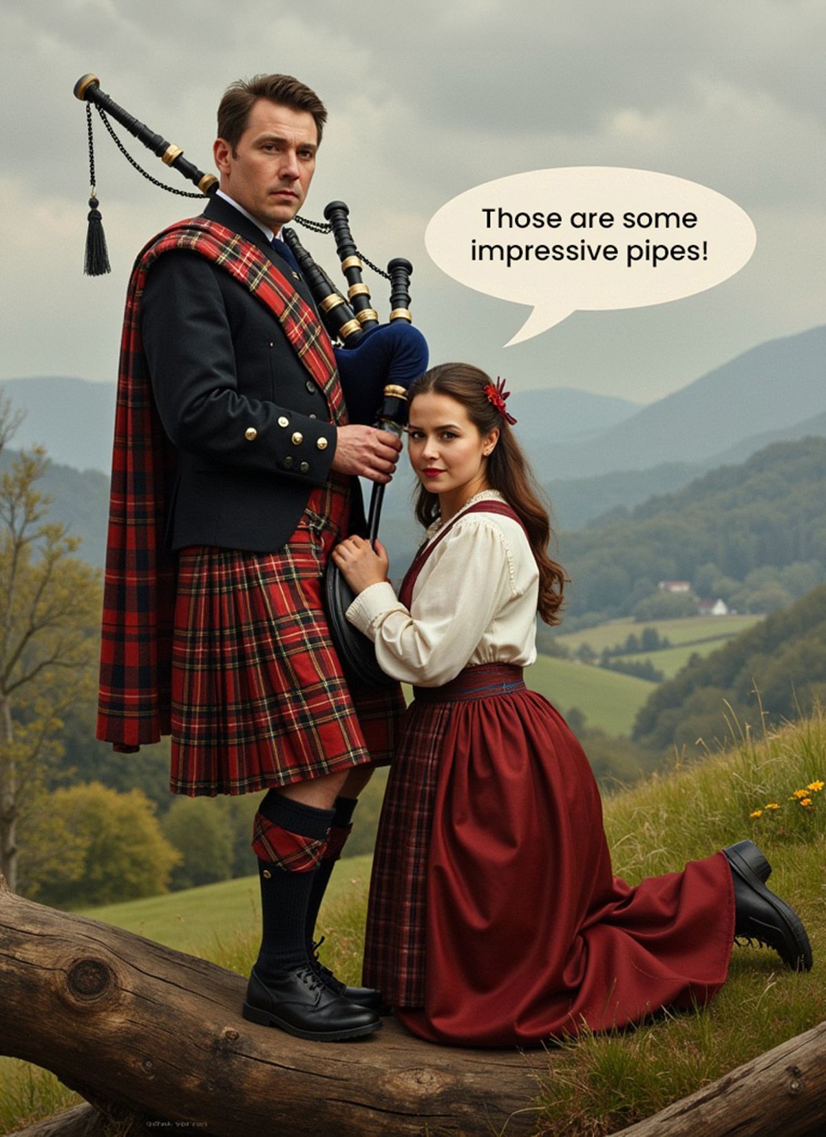 Big kilt energy. Swap your face onto this proud bagpiper scene and let the joke land before the first note does.