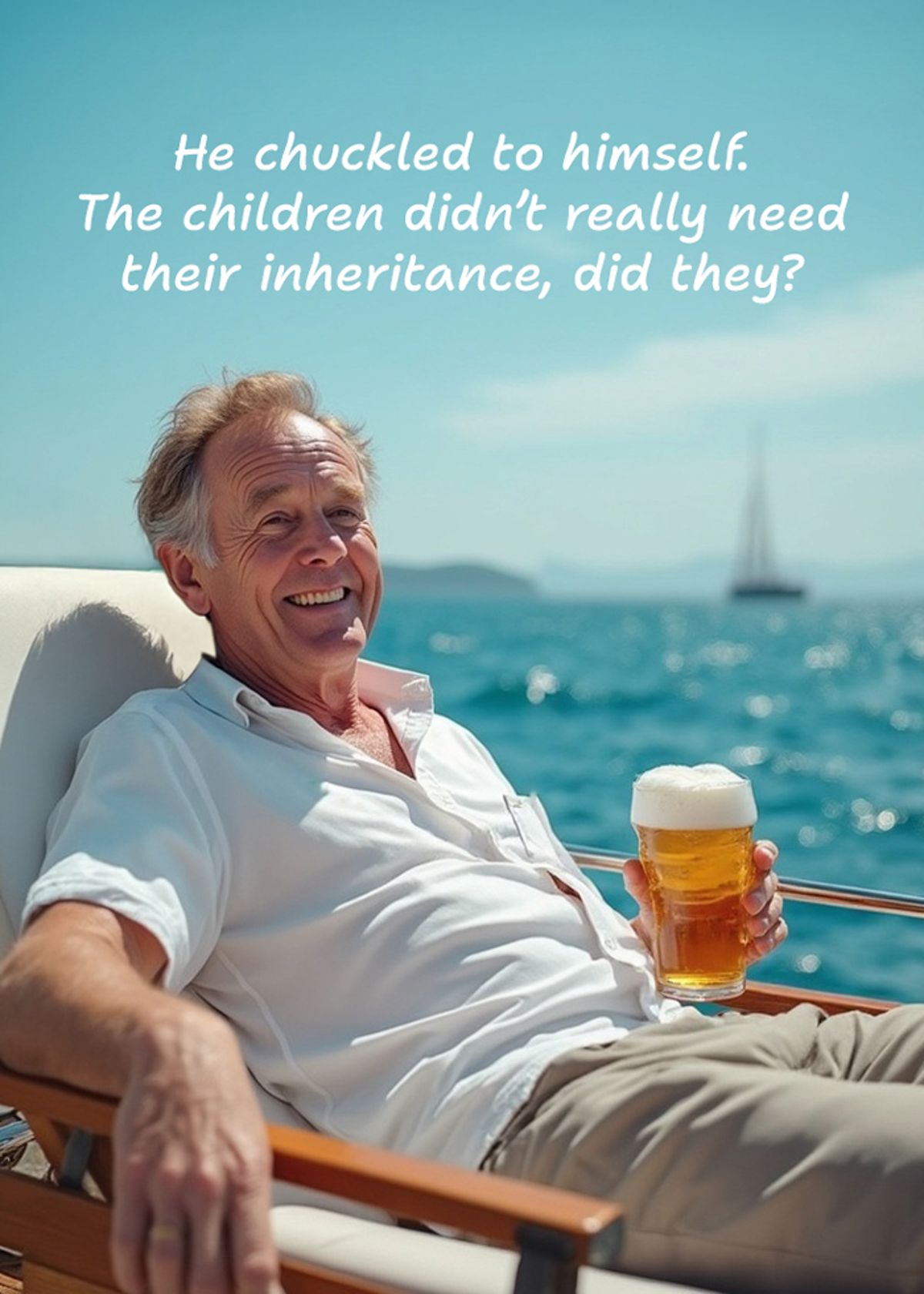 Swap your face onto this smug yacht lounger and serve rich troublemaker energy with a beer in hand and the inheritance safely delayed.