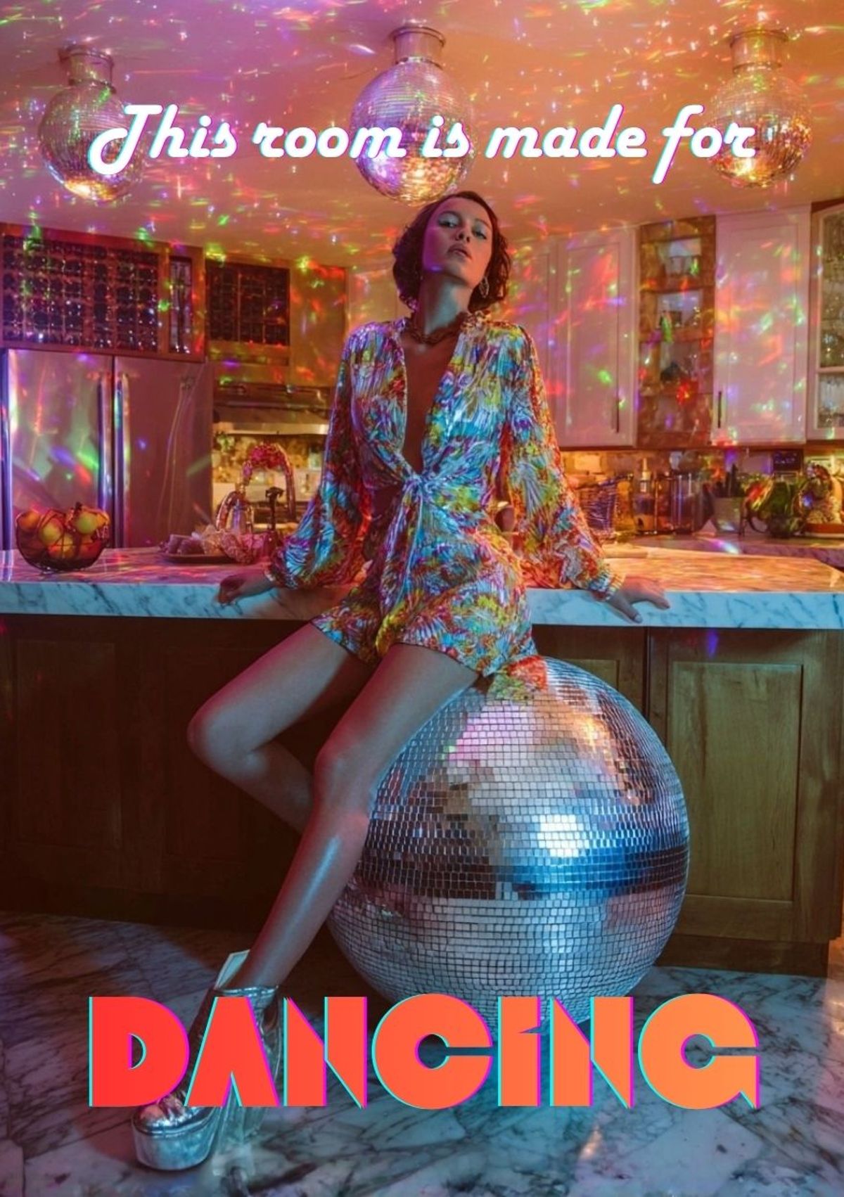 Swap your face into this glitter-soaked disco scene and turn your kitchen into the hottest dance floor in town.