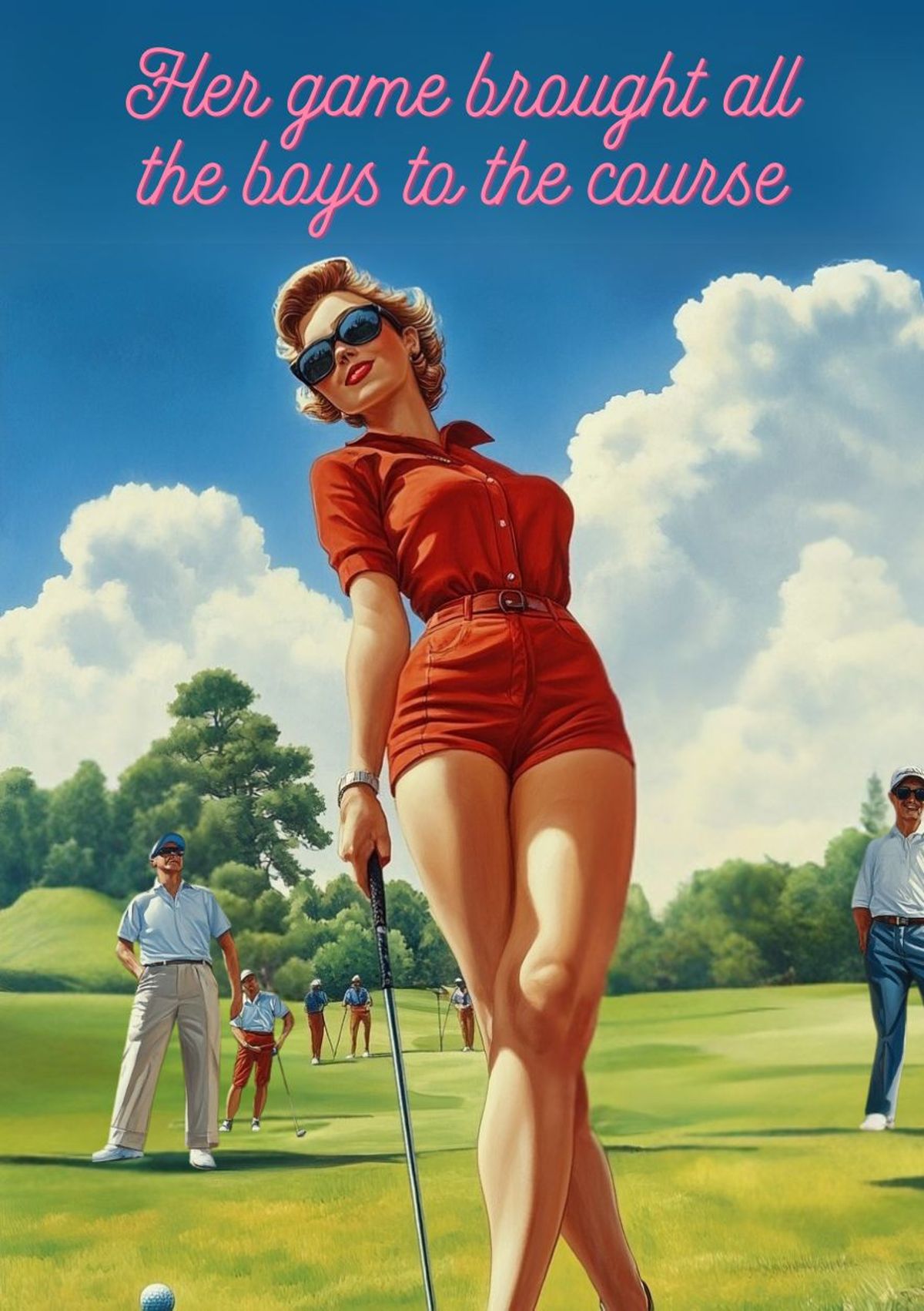Swap your face onto this cheeky retro golf pinup and turn a simple tee-off into the hottest show on the fairway.
