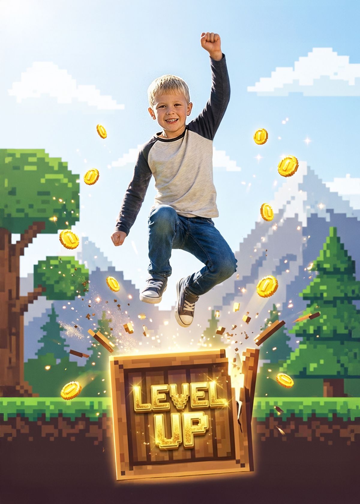 Game on. Swap your face into this pixel-powered level-up scene and bounce straight into main character status.
