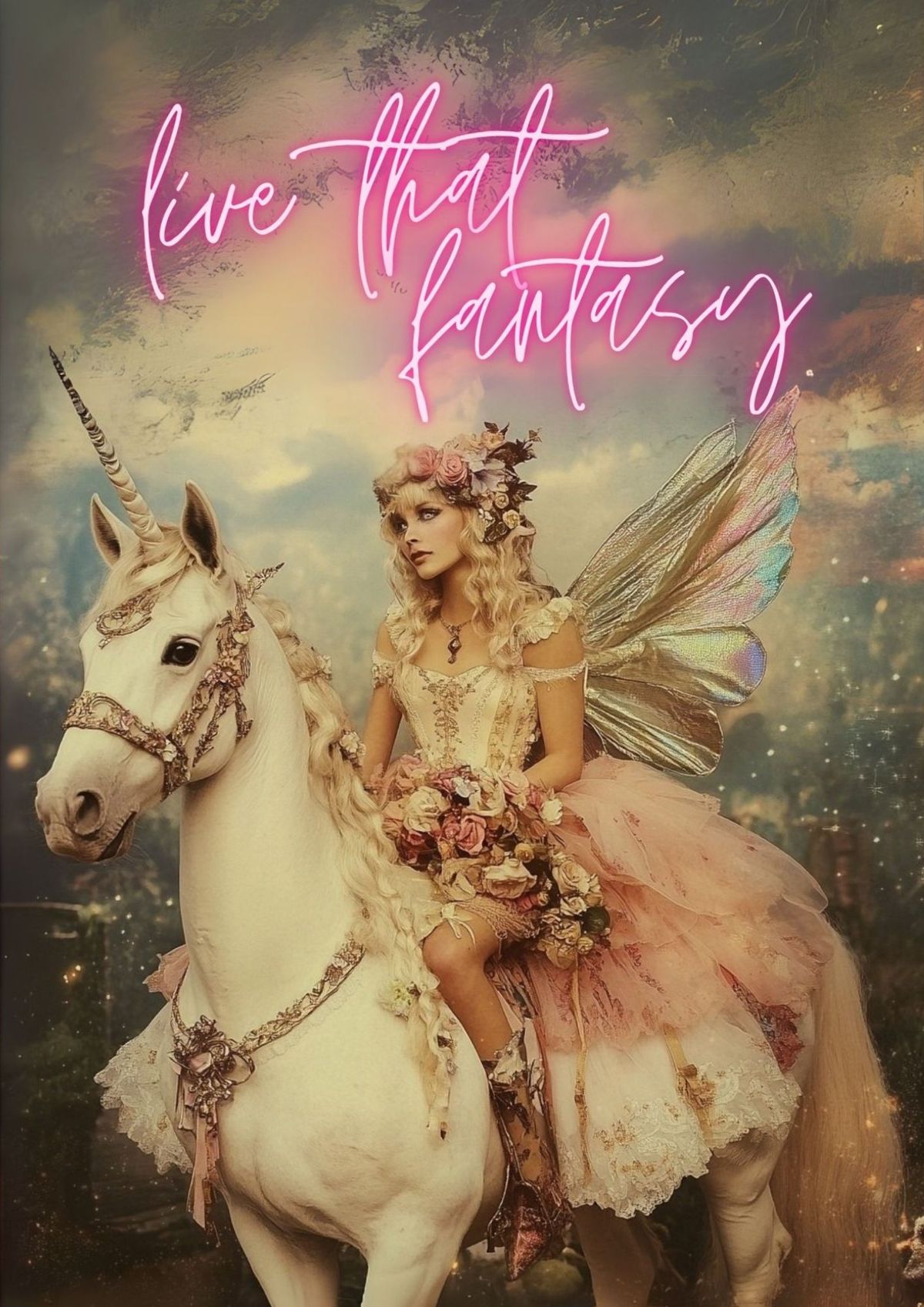 Trade reality for glitter and glory. Swap your face onto this unicorn-riding fairy scene and make the fantasy look made for you.