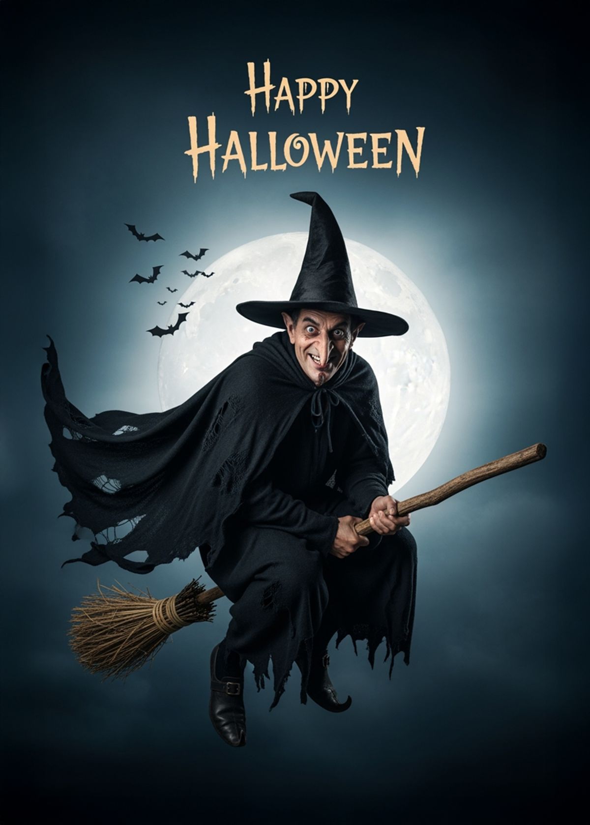 Cackle your way into Halloween by swapping your face onto this broomstick-riding witch and stealing the moonlit spotlight.