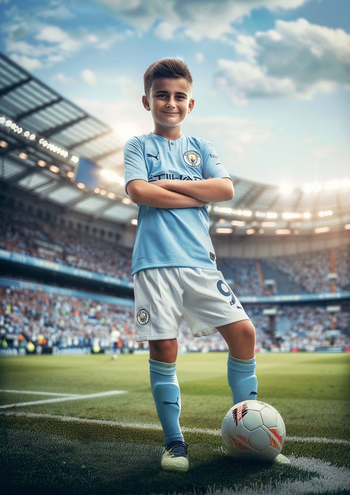 Main character at kick-off. Swap their face onto this young football star and let them stride onto the pitch like the whole stadium came to watch.