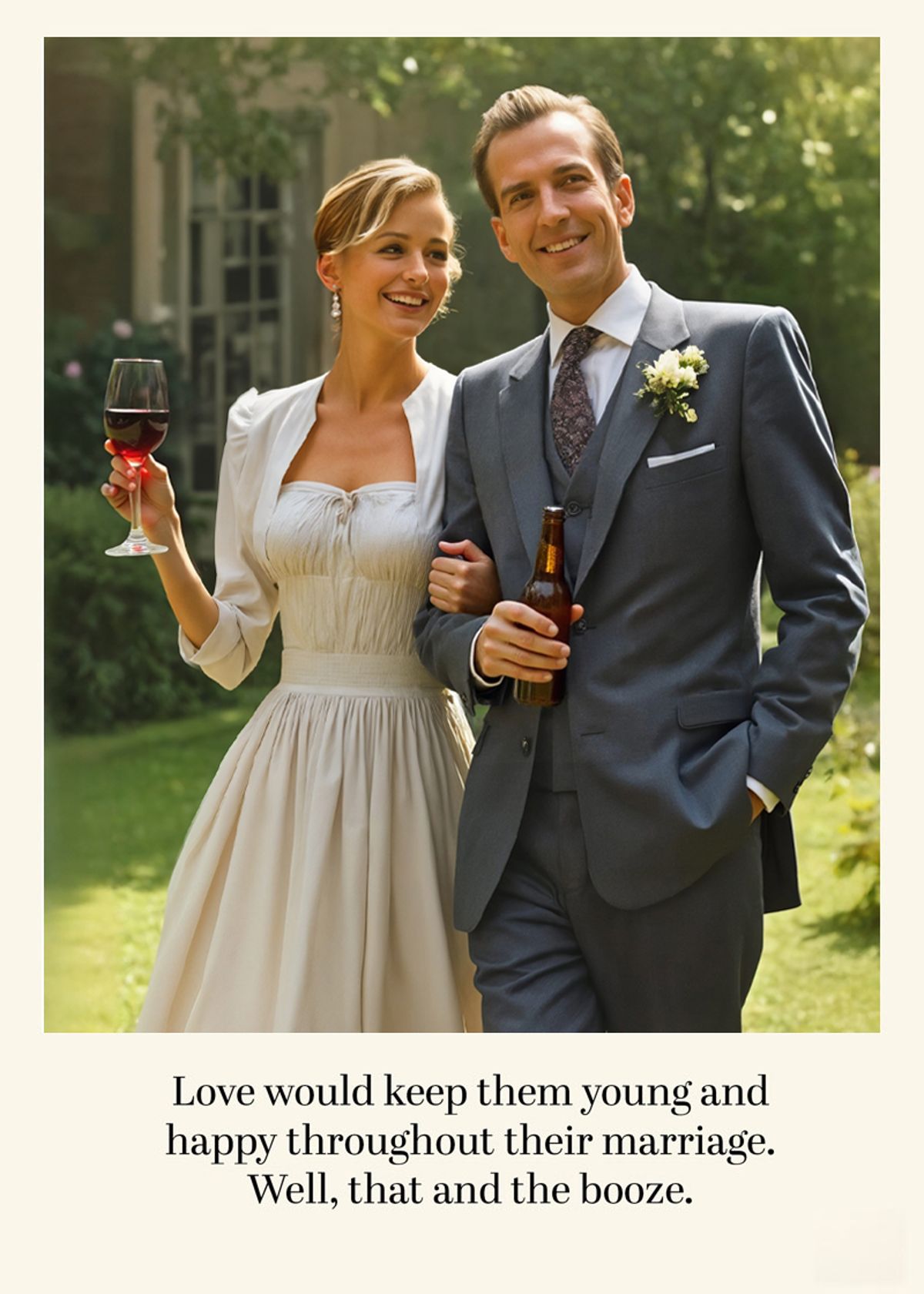 Swap your faces onto this happy wedding duo and let love, laughter, and a cheeky drink steal the spotlight.