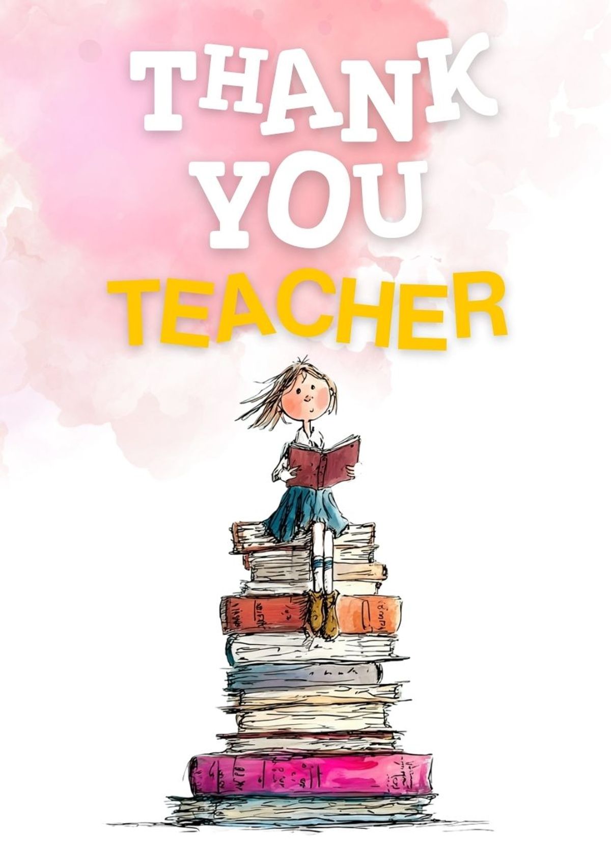Top of the class. Swap their face onto this charming book-stack illustration and turn your thank you teacher message into an A-plus keepsake.