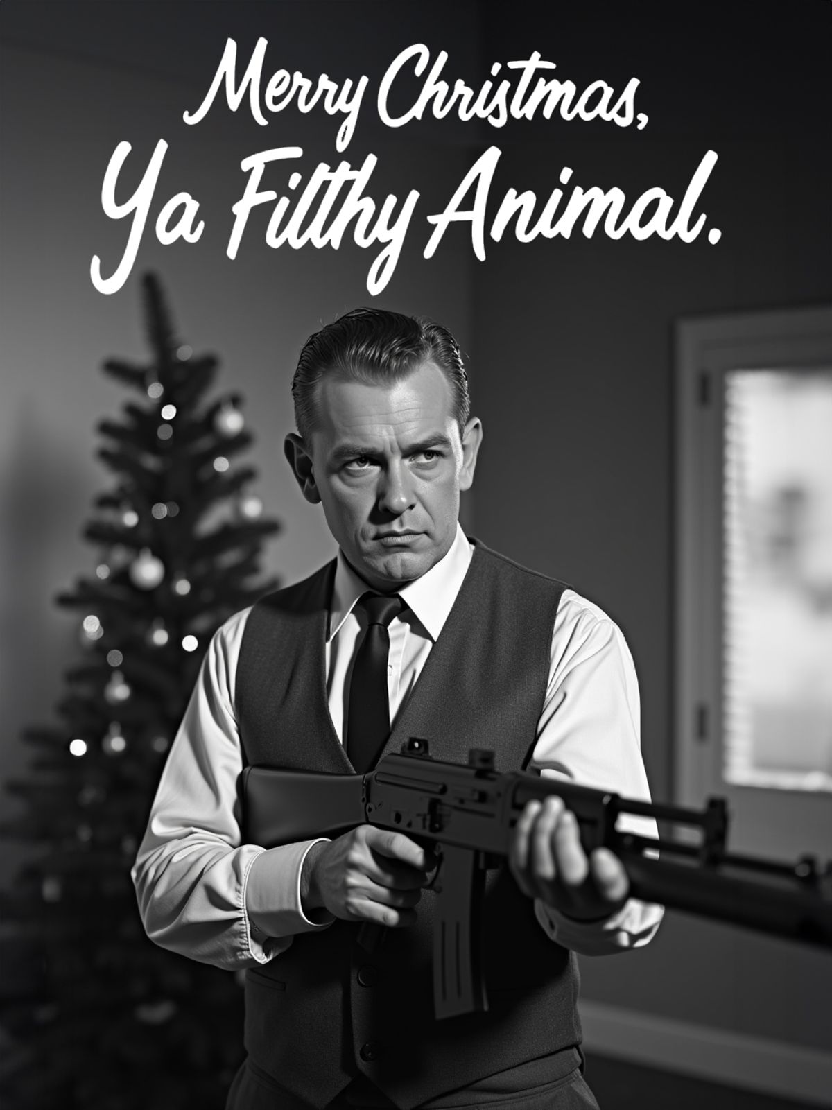 Bring big black-and-white bad guy energy to Christmas by swapping your face into this gloriously over-the-top festive gangster scene.