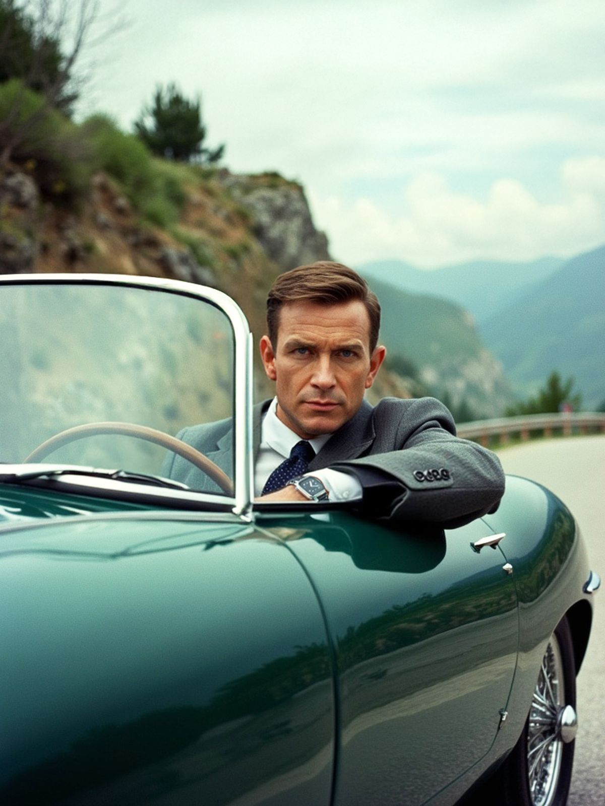 Sharp suit, classic wheels, your face. Swap in and take the mountain road like a man with secrets.