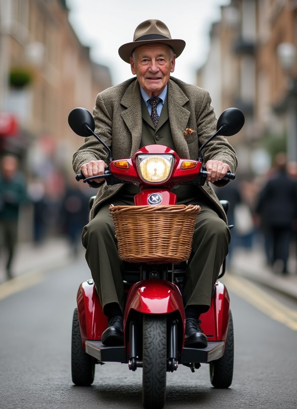 Swap your face onto this dapper mobility scooter rider and own the high street with effortless swagger.