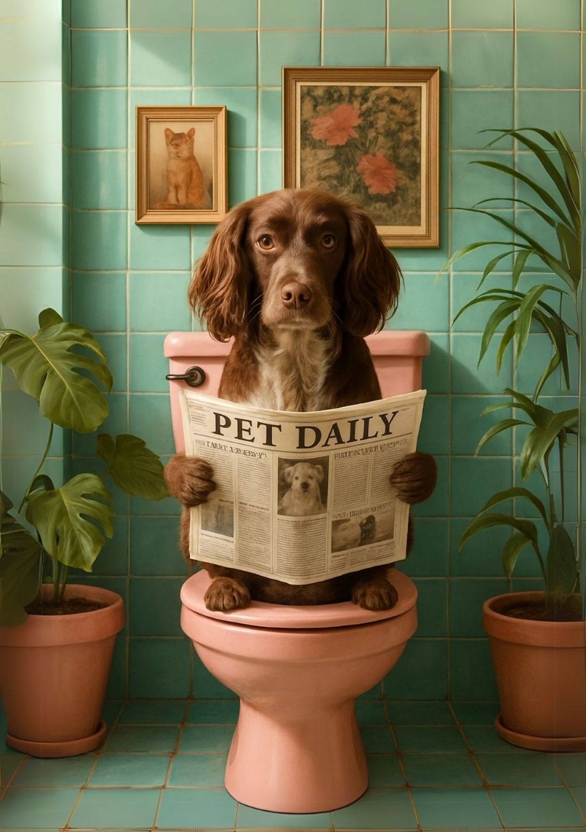 Swap your pet into this hilariously serious bathroom scene and turn their daily business into front-page news.