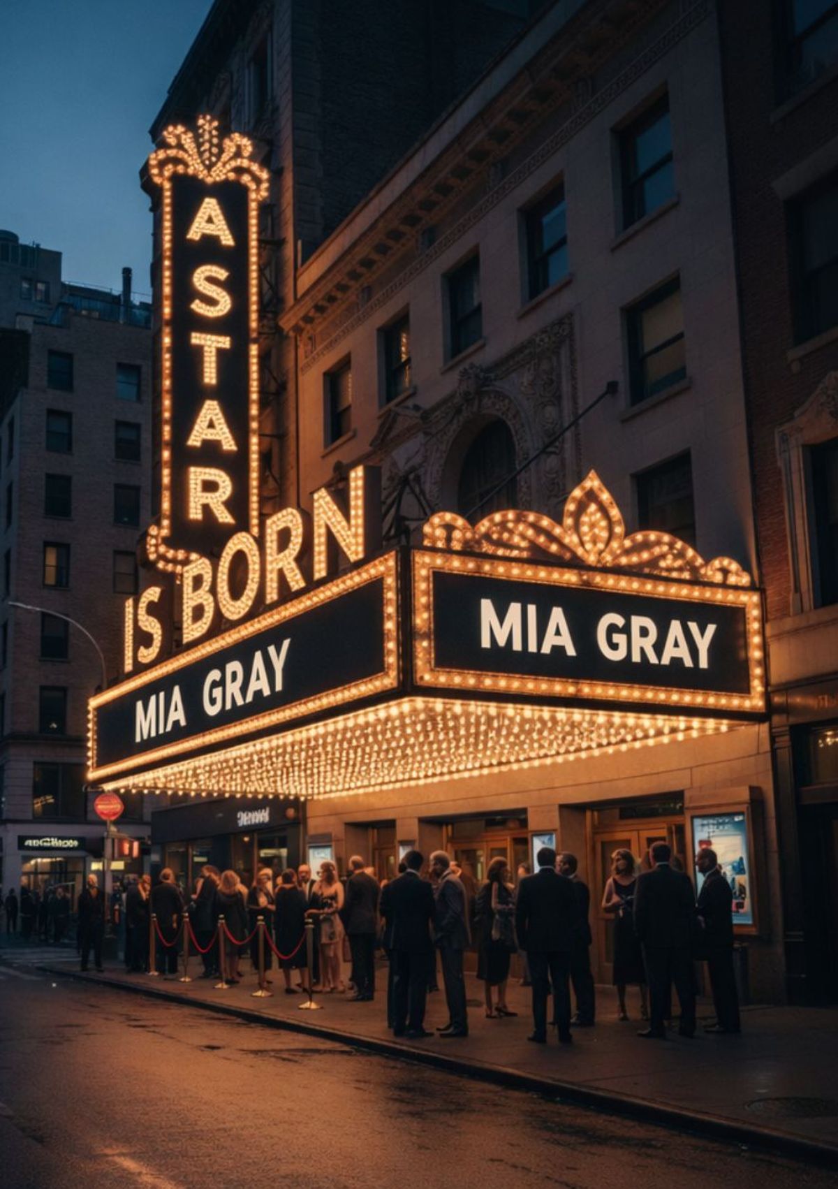 Big opening-night energy. Swap in your name and turn a glowing theatre marquee into your own show-stopping debut.