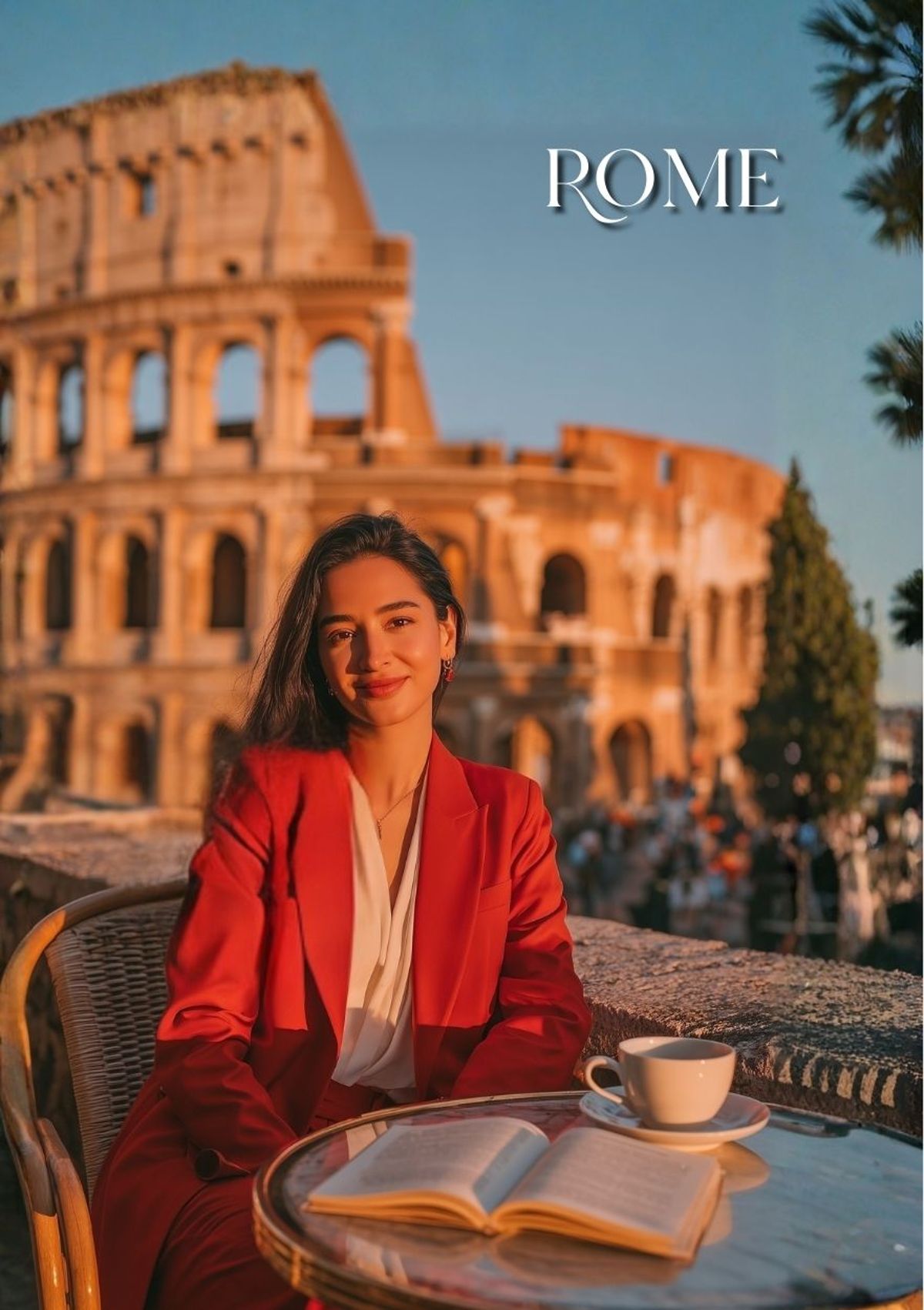 Swap your face into this sun-soaked Rome cafe scene and sip up effortless getaway glamour beside one of the city's most iconic views.