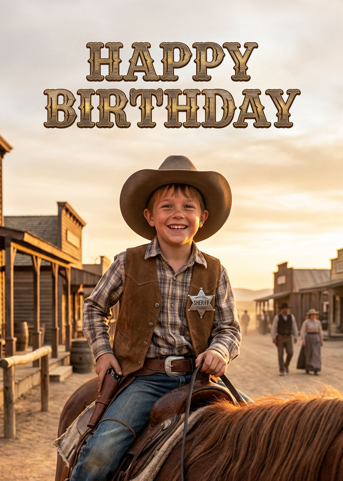 Round up the birthday cheers by swapping their face onto this saddle-ready sheriff and letting them ride into the big day like the star of the frontier.