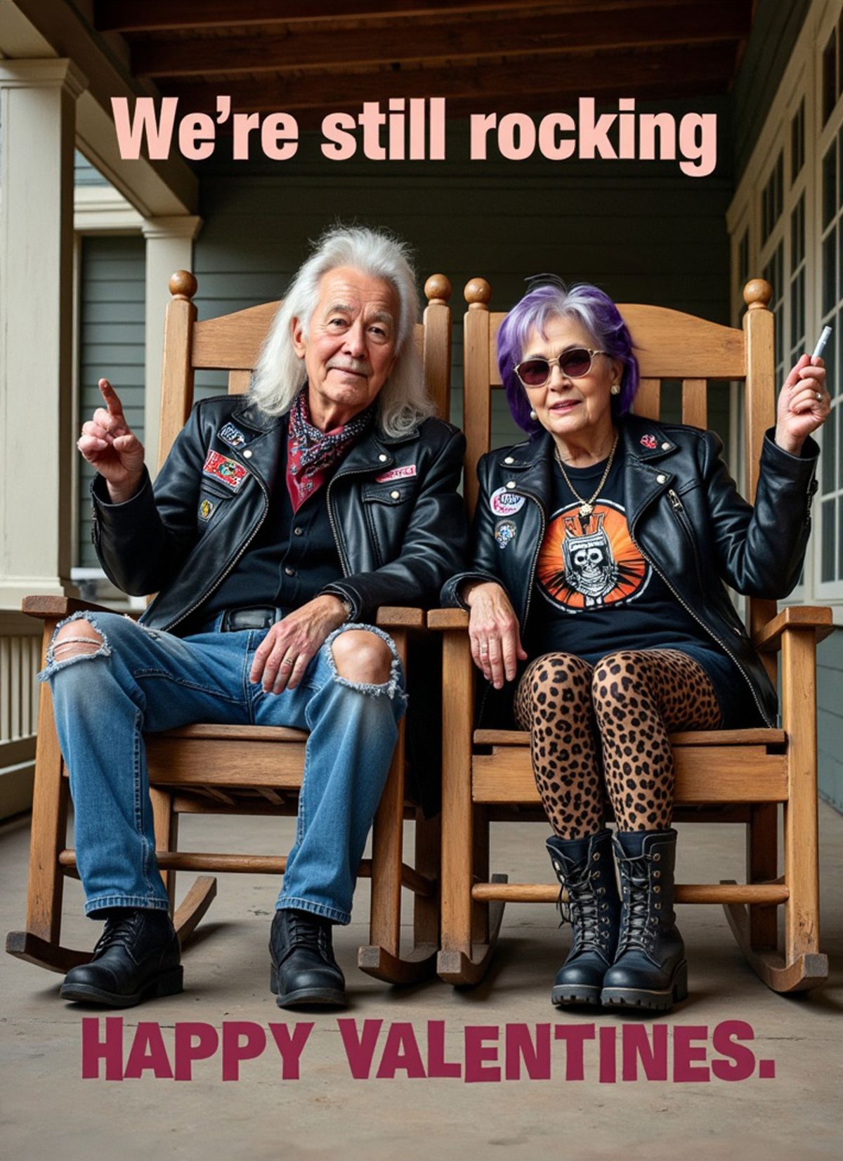 Love never mellowed out. Swap your faces onto this leather-clad rocking-chair duo and send a Valentines card with rebel spirit to spare.