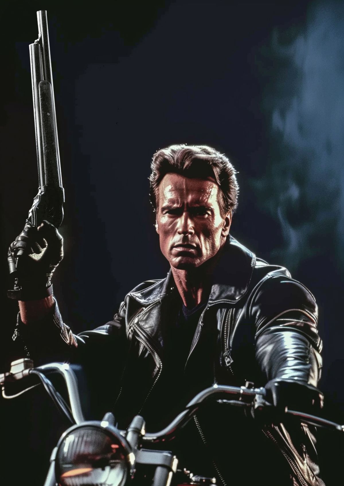 Steely stare, leather jacket, zero nonsense. Swap in your face and take Arnold Schwarzenegger's biker look for a seriously dramatic entrance.