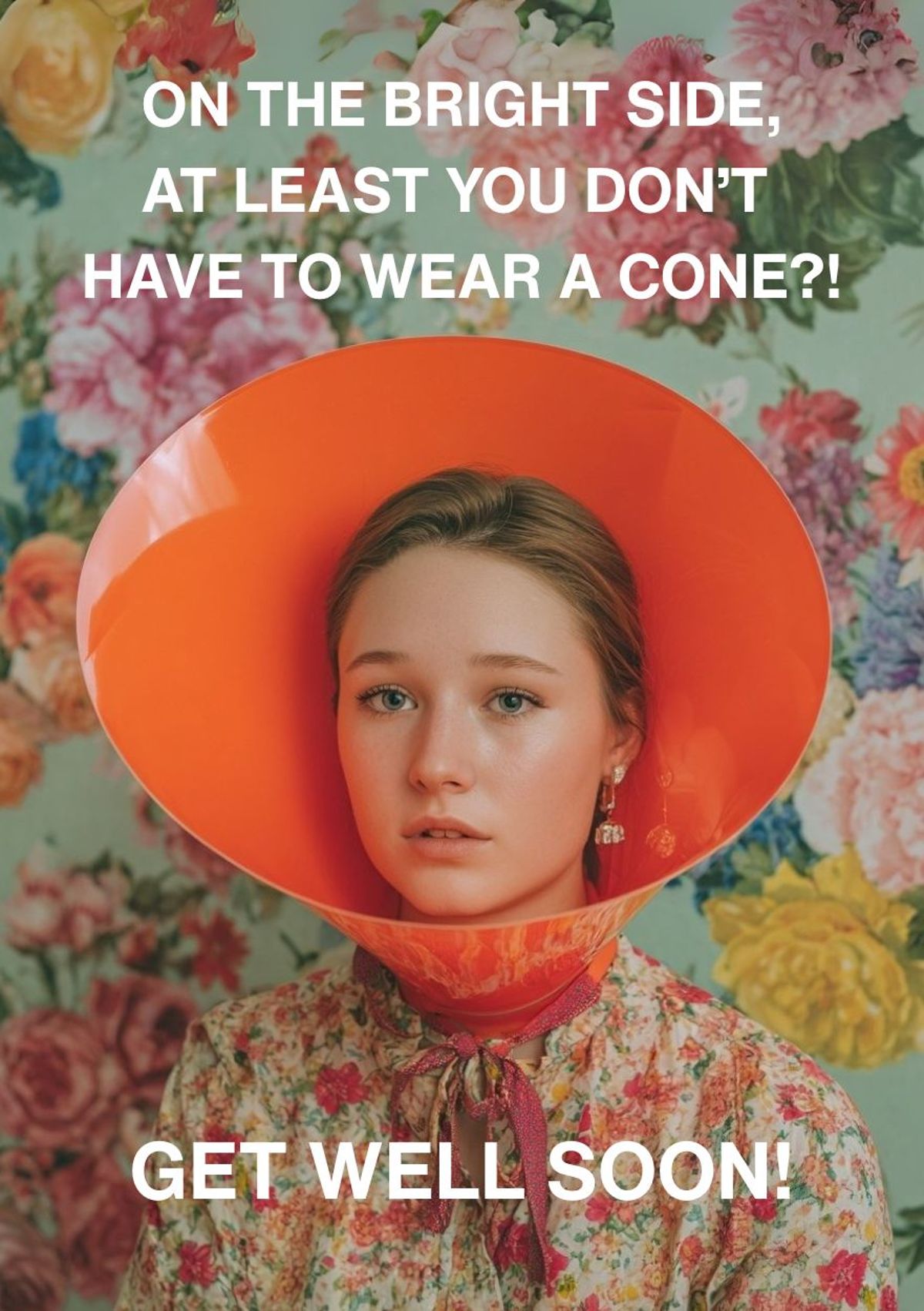 Recovery looks better on you. Swap your face into this floral cone-of-shame scene and send get well soon wishes with a laugh.