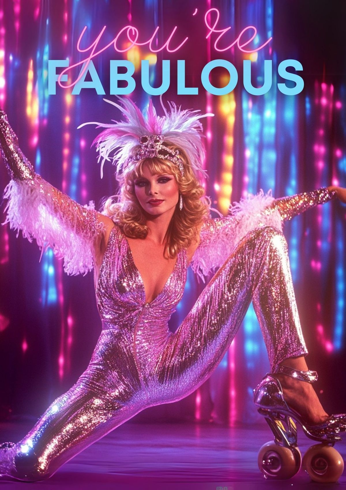 Swap your face onto this glitter-drenched roller disco diva and give fabulous the starring role it deserves.